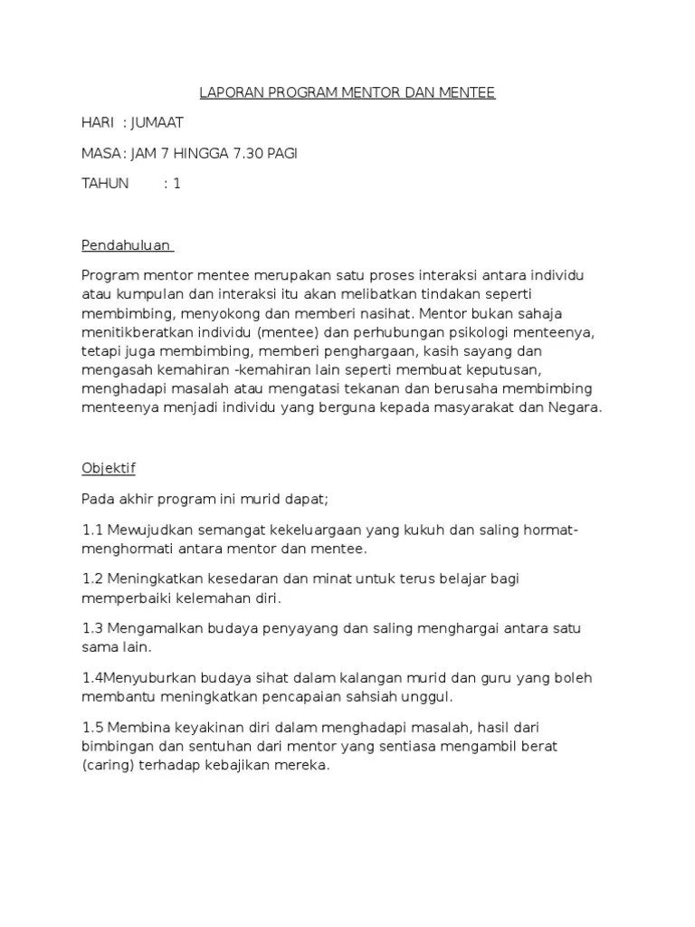 8172019 laporan program mentor mentee 13 laporan program mentor mentee sambutan haji jadi kali pertama tahun 2016 program sambutan hari jadi 2015 telah . Rujukan kumpulan nama mentor nama. Laporan mentor mentee 2020 flip ebook pages 1 2 anyflip anyflip. Contoh laporan mentor mentee 1. Contoh kertas kerja program champion mentor mentee champion . Laporan pelaksanaan program mentor mentee. Bagi fasa pertama ini, aktiviti yang perlu dilaksanakan adalah : 1.0 panduan pelaksanaan program mentor mentee kementerian pelajaran malaysia.